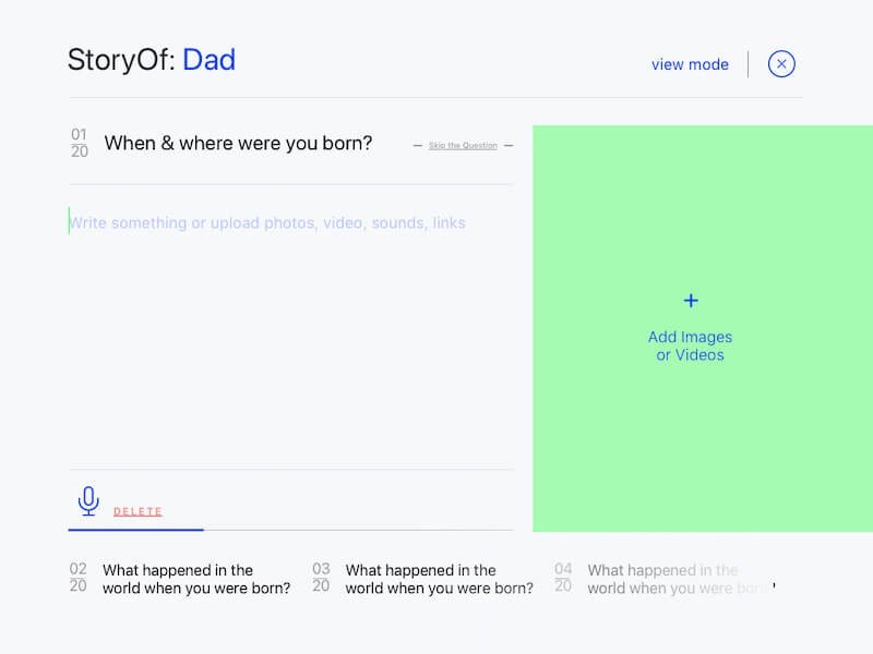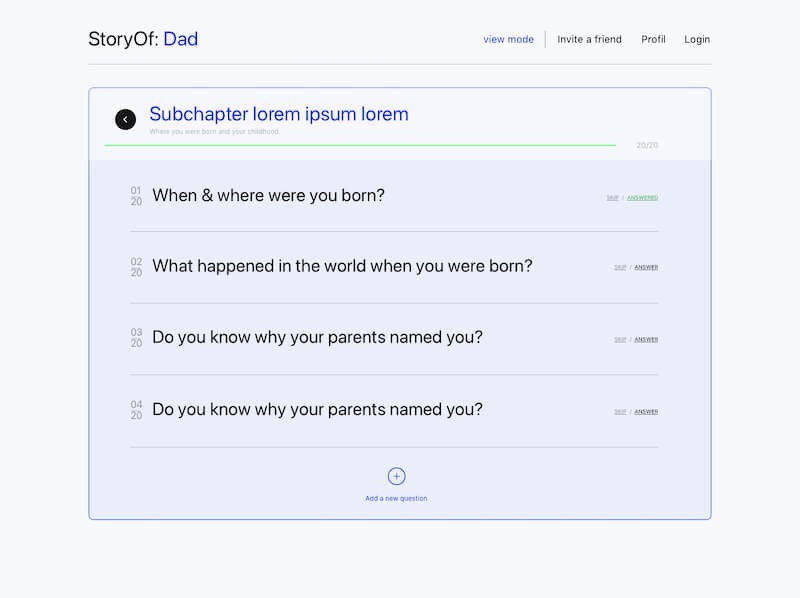 StoryOf is an interactive question book that helps you capture your life experiences, from world events at the time of your birth to your aspirations for the future. Conceived by a renowned German digital team, the platform mirrors their ethos of being a dynamic, independent, and brave digital space. The essence of StoryOf is to serve as a deeply personal record, where photos, videos, and music enhance the recollection of cherished moments, emphasizing the importance of shared stories and loved ones in our lives.
